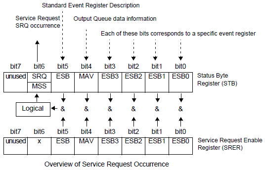 When any bit selected by the mask is set, bit 6 (MSS; the Master Summary Status) of the Status Byte Register is also set, which generates an SRQ (Service Request) message and dispatches a service request.