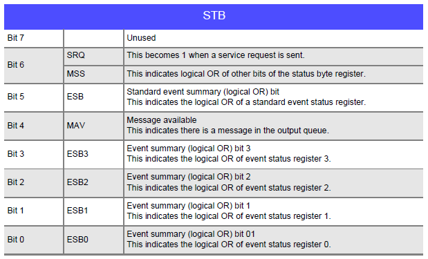 The MSS bit is only read by an "*STB?" query and is not cleared until the event is cleared by a command such as a "*CLS" command.