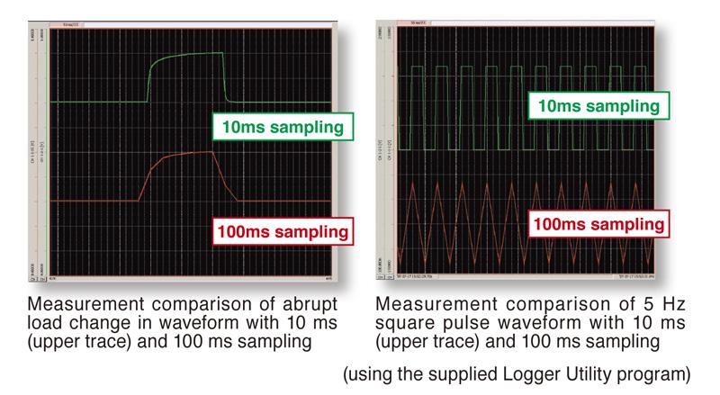 The development of hybrid and electric automobiles requires instruments that can measure abrupt load changes. The instrument can reliably capture even abrupt changes in load since it can measure channels 1 to 15 in 10 ms. Channels 16 to 30 provide 20-ms sampling. Note: Measurements on channels 31 to 60 provide 50-ms sampling.