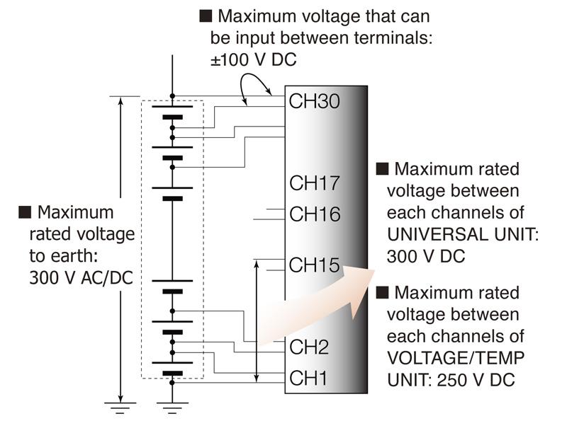 The HiLOGGER measures not only fuel cells, but also batteries for UPS (uninterruptible power supplies) devices used in buildings as well as batteries consisting of cells and packaging connected in stacks that require multi-point measurements. In such measurements, high voltage for the whole stack is applied between channel-to-channel and channel-to-ground. The universal unit delivers safe measurement thanks to a high-withstand-voltage design featuring a maximum rated channel-to-channel voltage of 300 V DC. (Maximum rated voltage between each channels of VOLTAGE/TEMP UNIT: 250 V DC) Note: Isolation between channels is possible through the use of semi-conductor relays. Voltage exceeding the product specifications, such as that originating from lightning surges or other sources, should never be applied between each channel; otherwise the relays will short and the recorder will be damaged.