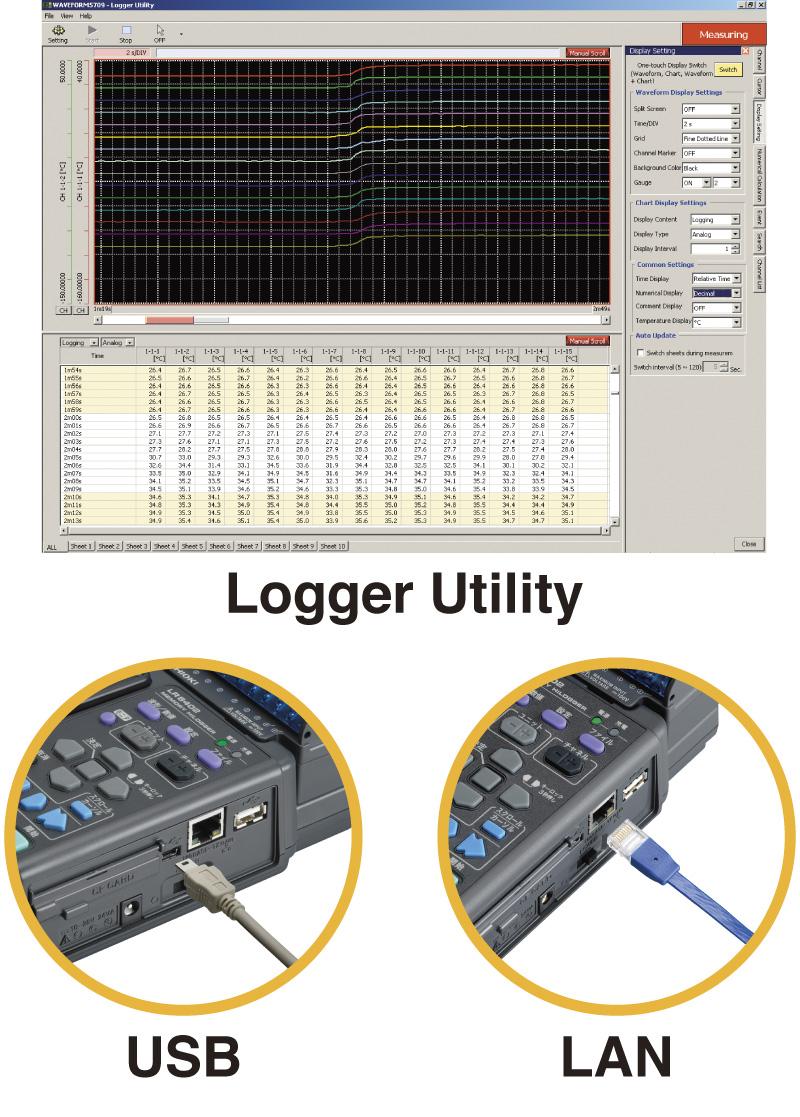 The supplied Logger Utility software enables processing of measurement data on a PC. Use the supplied Logger Utility software to record data on a PC in real-time. View past data during recording. Connect the PC to the HiLOGGER using USB or via LAN.
