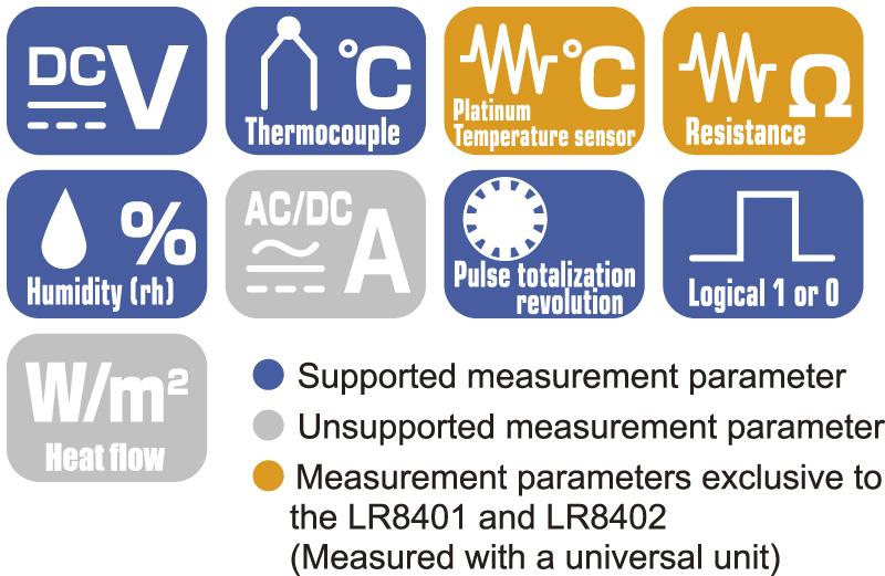 Caution: Built-in units cannot be removed or changed. The Battery pack Z1000 is sold separately Model LR8400 : Built-in units are equivalent to the Votage/temp unit LR8500 ×2 Model LR8401 : Built-in units are equivalent to the Universal unit LR8501 ×2 Model LR8402 : Built-in units are equivalent to the Universal unit LR8501 (15 ch) ×1, and the Votage/temp unit LR8500 (15 ch) ×1