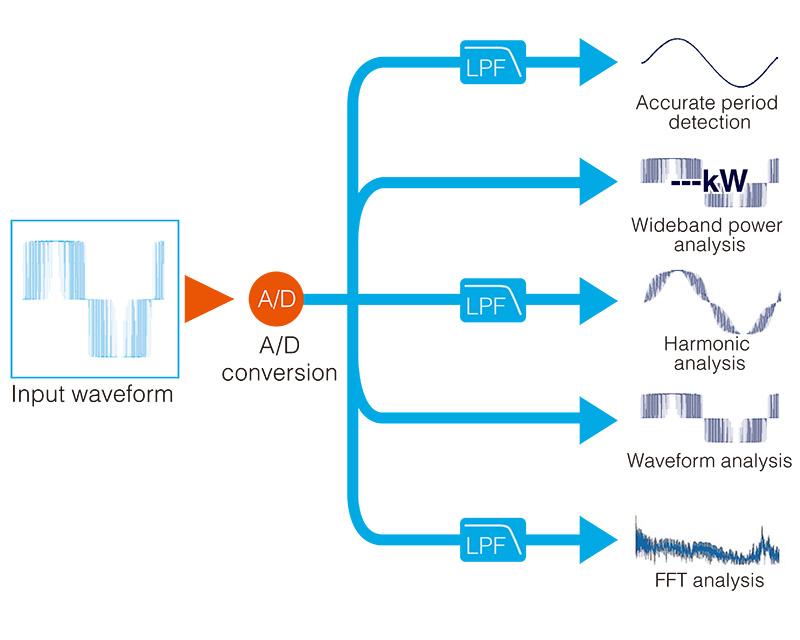 All measurements, including period detection, wideband power analysis, harmonic analysis, and waveform analysis, are digitally processed independently and with no effect on each other. Fast calculation processing is used to achieve a data update speed of 10 ms while maintaining maximum accuracy.