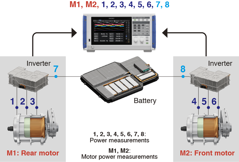 In the following experiment, Hioki used a Power Analyzer PW8001-11 (with motor analysis function) and Hioki's high accuracy current sensors to measure the power of two motors (front and rear) as well as the power inputs and outputs for each motor’s inverter to determine the power conversion efficiency and loss for each motor system.
