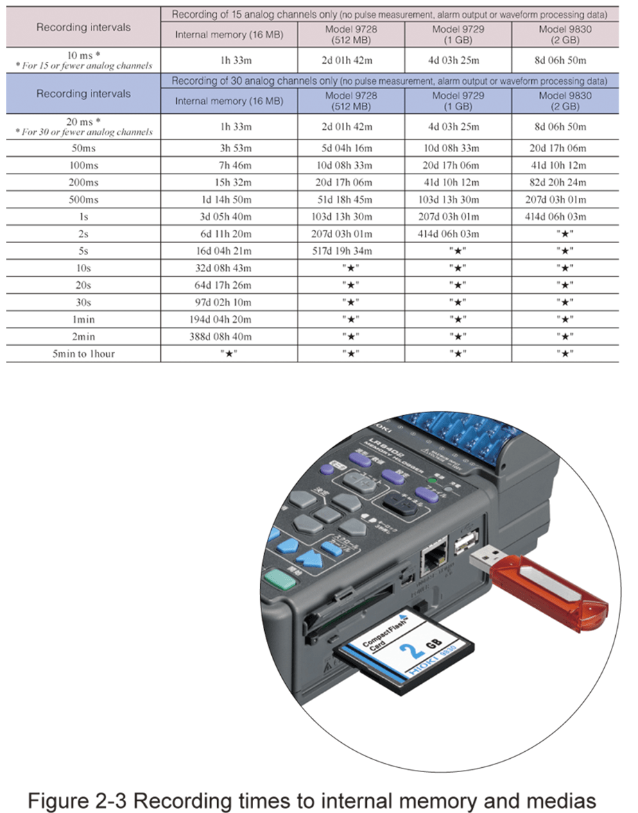 Figure 2-3 provides a list of recording intervals (sampling speeds), data capacities, and recording times.