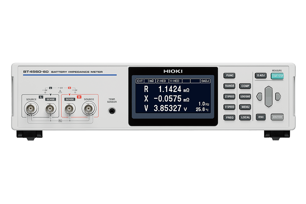 The Battery Impedance Meter BT4560-60 can make EIS(*1) measurements quickly and easily in applications ranging from R&D to manufacturing. With its wide EIS measurement frequency range of 0.01 Hz to 10 kHz, the BT4560-60 is especially suited for battery cell design research and development.