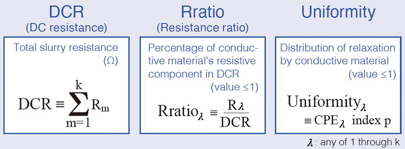 Analysis | Analysis method: Equivalent circuit analysis of impedance data Calculation parameters: DCR, Rratio of each relaxation, uniformity of each relaxation |