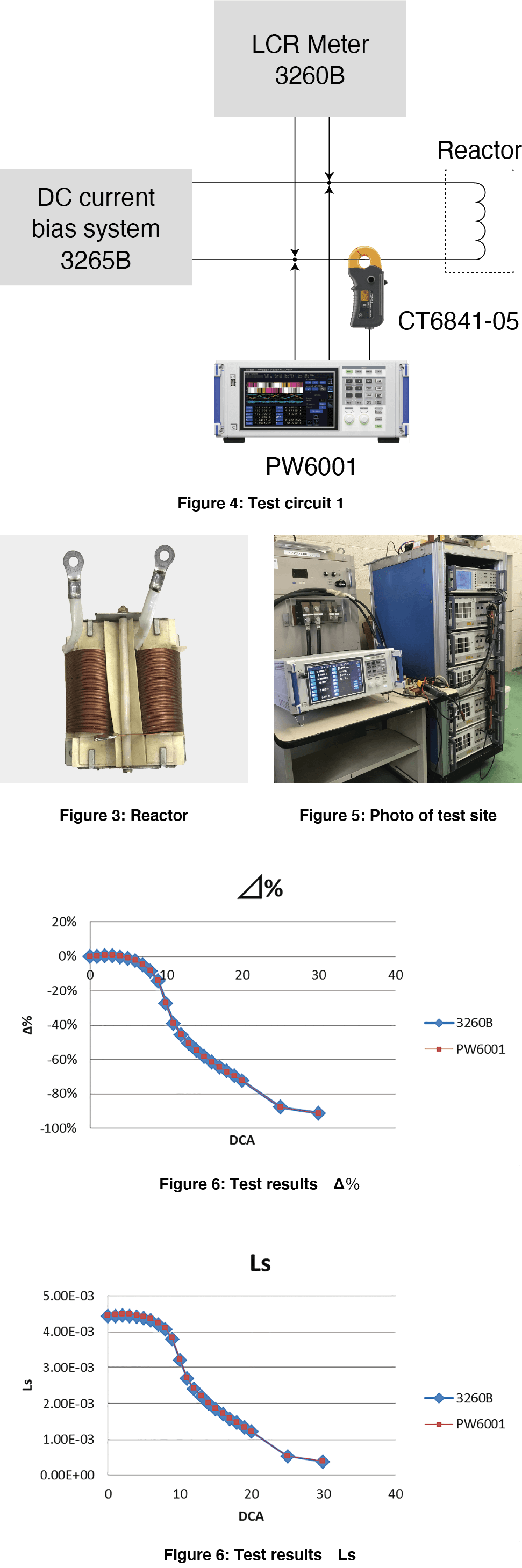We prepared a 4 mH reactor (see Figure 3) and recorded inductance values from 0 A to 30 A with a measurement frequency of 1 kHz using a DC bias testing setup from Wayne Kerr. We also configured a Hioki Power Analyzer PW6001 internally with a formula to calculate inductance values from an LCR meter’s measurement AC voltage and AC current values as superposed on a bias device’s DC current and the measured phase angle value and used the instrument to measure inductance values (see Figures 4 and 5).