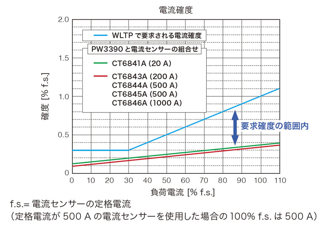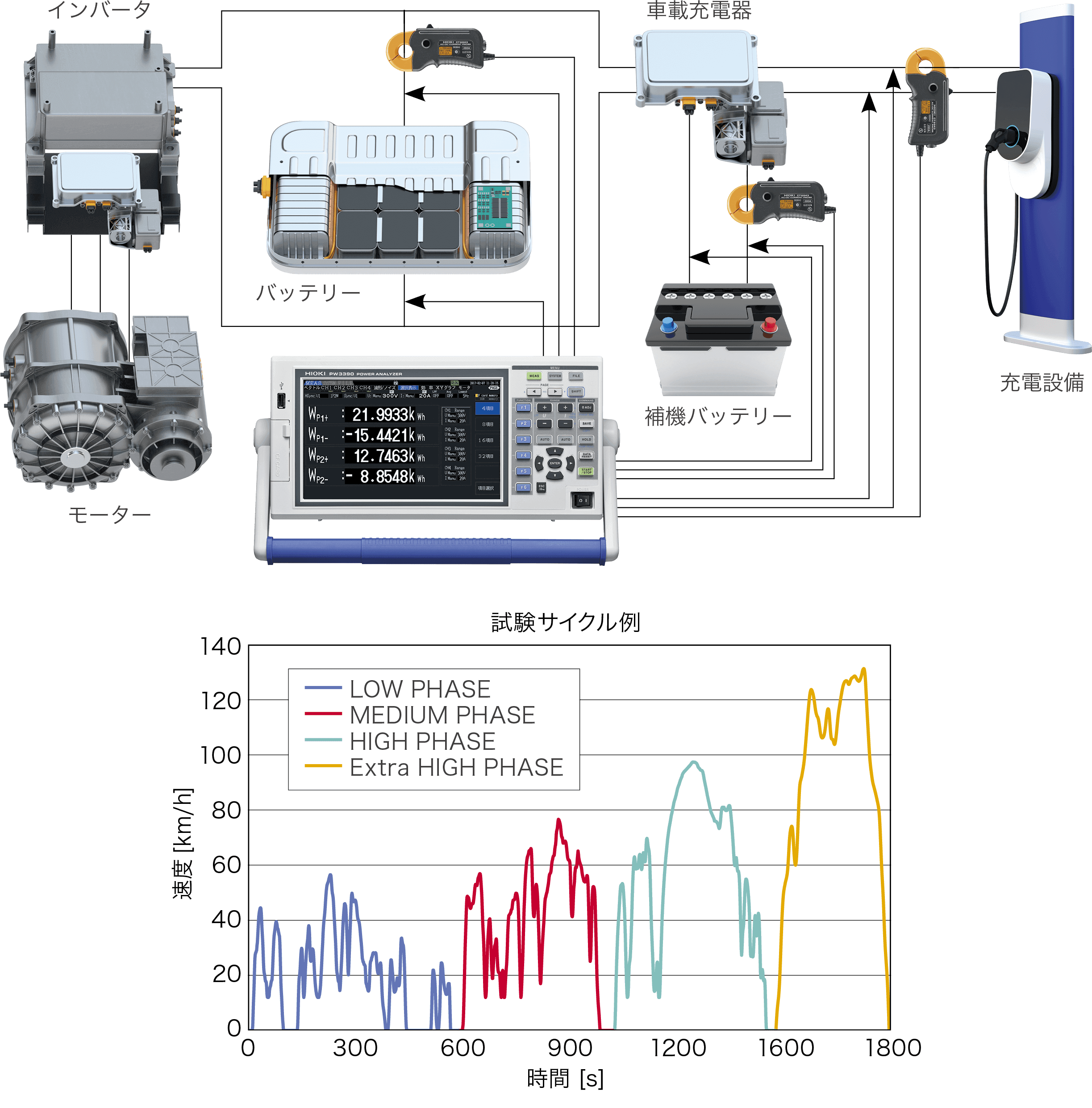 高確度クランプ電流センサーとパワーアナライザ PW3390の優れたDC確度、50msインターバルの電流積算と電力積算は、燃費性能評価に大変有効です。