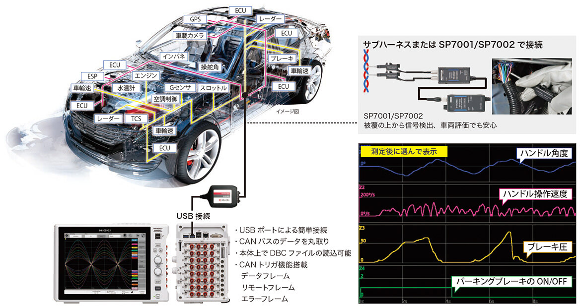 非接触CANセンサSP7001, SP7002を使えば、サブハーネスの準備やケーブル加工などの煩雑な準備なしにCANバスをモニターできます。