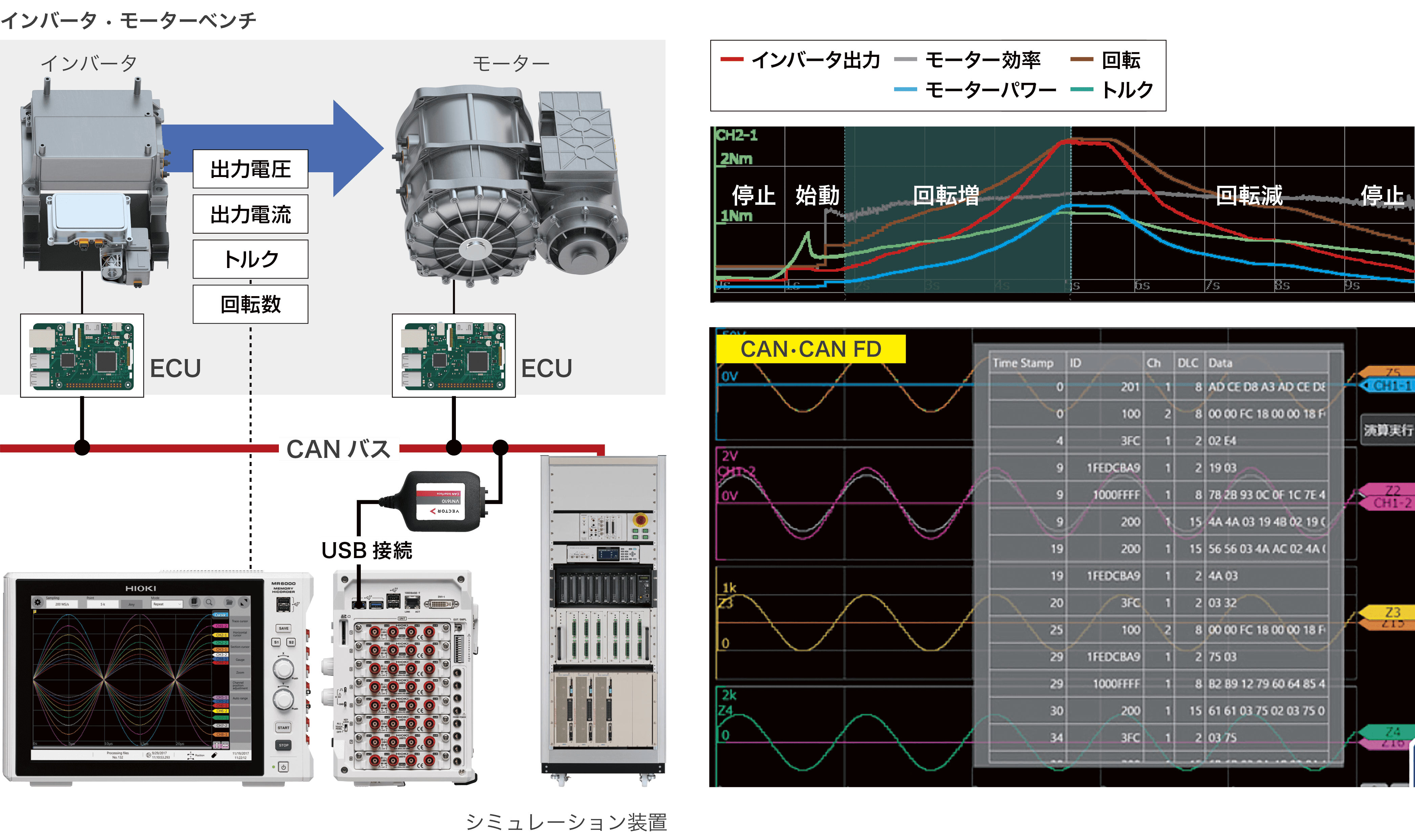 インバータの出力電圧・電流、トルク、回転数などと合わせてCAN信号を取得することで、想定される様々な場面でのモーター特性やモーター効率を求めることができます。