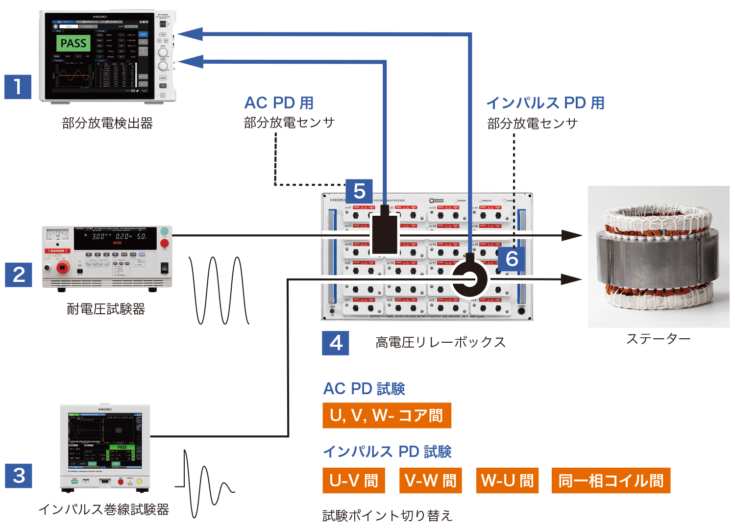 耐電圧試験器、インパルス巻線試験器から試験電圧を印加し、部分放電センサで部分放電を検出します。部分放電検出センサを高電圧リレーボックス SW2001に内蔵することで、合理的なシステム構成が実現できます。