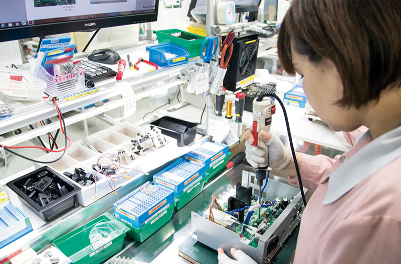 お客様が要求する高品質の製品を最も経済的に生産し、安定供給するために、生産工程と製造技術の標準化を図り、地球環境にやさしい効率的な生産を追求しています。また、電気計測器は、その性質上高い品質と信頼性を確保しなければなりません。高品質かつ高精度でばらつきの少ないモノづくりを追求し、人と機械の調和を目指した自働化を推進しています。