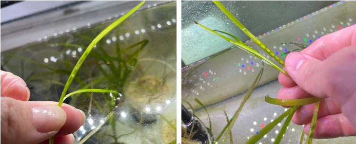 - (左)日置中学校水槽のアマモ (右)HIOKIのアマモ
