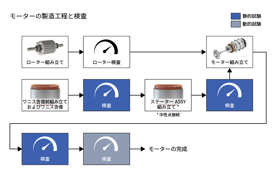 モーター製造プロセスは、図1に示す通り、おもにローター組立、ステーター組立、およびモーター組立の3つの段階で構成されます。高品質なモーター生産を保証するために、各段階で厳密な機械検査および電気検査が行われます。それぞれの組立工程の後には、安全性と性能を評価するために静的および動的評価が行われます。 この記事では、ステーターと完成したモーターに対して行われる6つの静的電気試験について詳しく説明します。