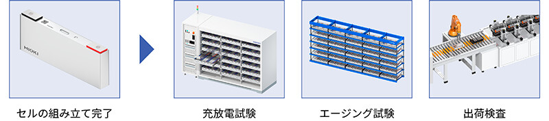電池セルへ電解液を注液し、組み立てが完了した後の各工程(充放電試験、エージング試験、出荷検査など)で内部抵抗検査を実施しています。