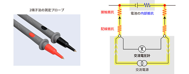 1Ω以下の低抵抗を測定する場合、4端子法で内部抵抗を測定します。抵抗の測り方には、「4端子法」と「2端子法」があります。2端子法の測定値は、配線抵抗や接触抵抗といった「経路抵抗」を含むため、mΩ単位の低抵抗を正確に測定できません。