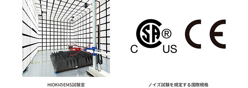仕様において測定レンジ・分解能・測定確度が良くても、抵抗値を正確に測れない場合があります。ノイズによって測定値が安定しない、正確な値が表示されないといったトラブルが起こるためです。(ノイズの発生源は電源や生産機器などさまざまです。)製品設計時にノイズを製品に印加し、正常に動作するかテストします。こうしたテストを行っていない製品は、生産ラインで測定仕様を満たさない恐れがあります。