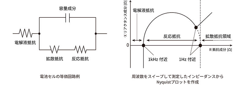 交流抵抗計(バッテリーテスター)は、検査対象に定電流の交流信号を印加します。この交流信号は一般的に1 kHzの固定周波数です。周波数を可変できる製品もあります。周波数をスイープして測定したインピーダンスからNyquistプロットを作成すると、電池の内部抵抗を「拡散抵抗」「反応抵抗」「電解液抵抗」などの要素に切り分けて把握できます。最近では、不良品の検出レベルを高めるために、複数の周波数で内部抵抗検査を実施するケースも増えています。