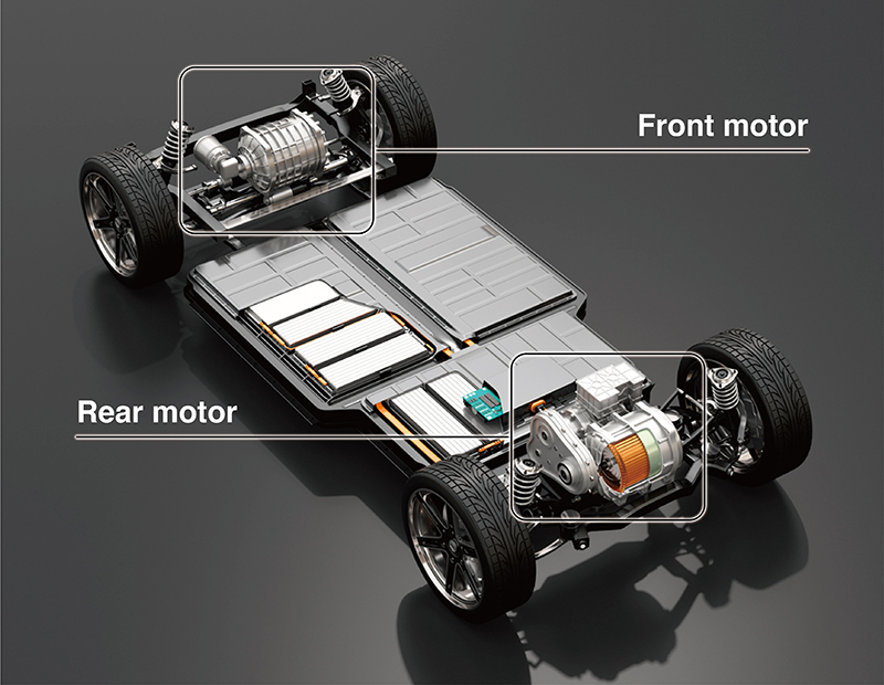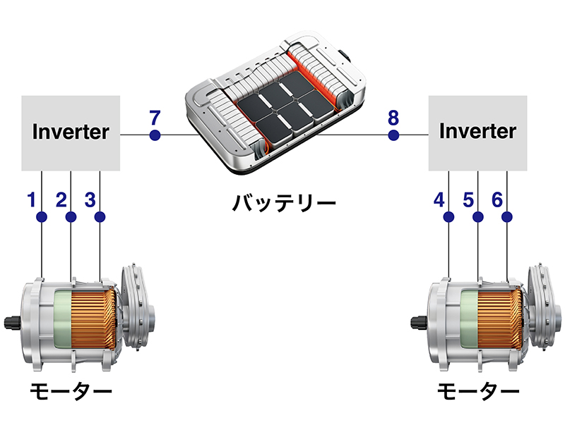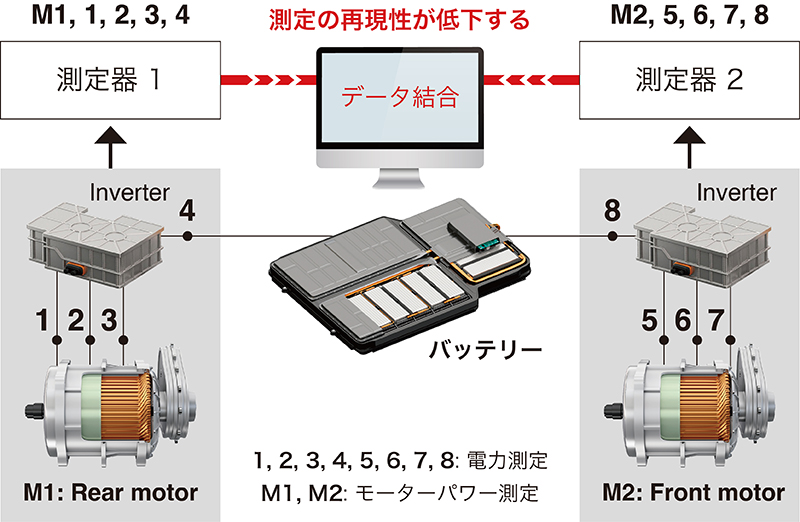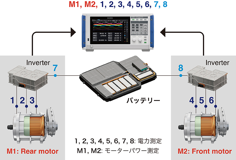 パワーアナライザPW8001-11(モーター解析機能付き)と電流センサーを使用して、フロントとリア2つのモーターパワーと各モーターに付随する2つのインバーターへの電力入出力を測定し、それぞれの電力効率と損失を測定しました。