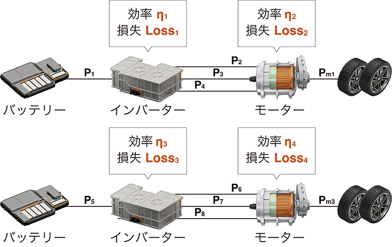 前輪モータ (Pm1) の効率だけ 94.2% とやや低く、3.4 kW もの損失が発生していることが分かる