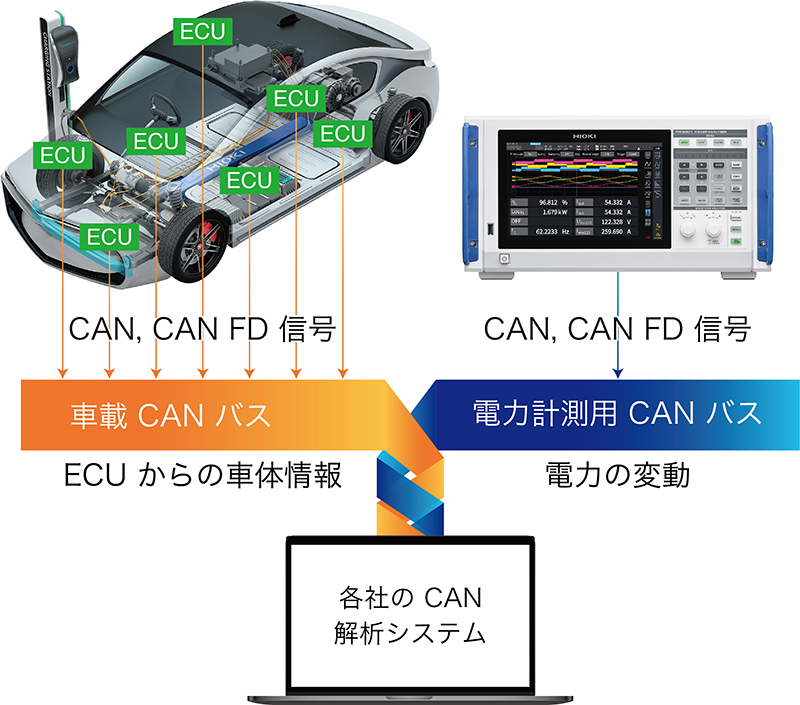 自動車業界向けとしては、測定データをCAN/CAN FD 信号としてデータ出力できる機能が搭載されました。これにより、電圧や電流、効率、損失だけでなく、バッテリーやモーターなどの各種ECUのデータを含め、車に係わるあらゆるデータを、時間のズレなく一元化し、総合的な評価が実現できます。