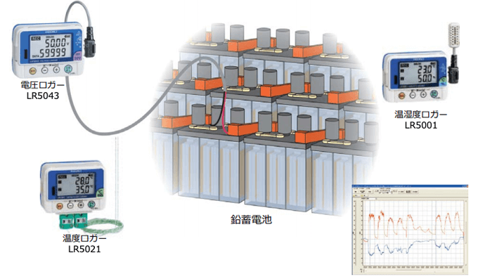 ・データミニシリーズの温湿度ロガーLR5001や温度ロガーLR5021を使って、非常用電源の環境温湿度、セルの表面温度を同時に測定して、1枚のグラフ上にデータをまとめることができます。