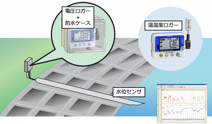 ・水位センサと電圧ロガーLR5041,LR5042,LR5043(※)を組み合わせて、河川の水位変化を測定します。