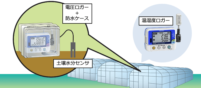 ・土壌水分センサーと電圧ロガーLR5041,LR5042,LR5043(※)を組み合わせて、畑やビニールハウスの土壌水分変化を測定します。