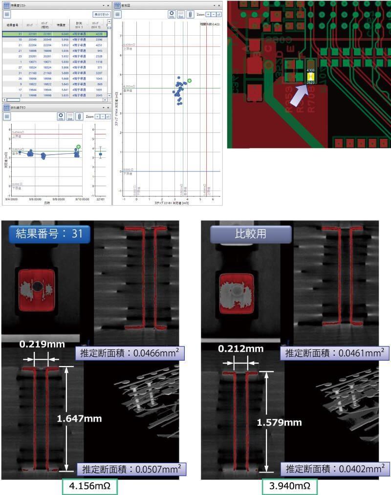 特異点として検出された基板と、検出されなかった基板のスルーホールをX線解析したところ、厚みと体積の違いが確認されました。