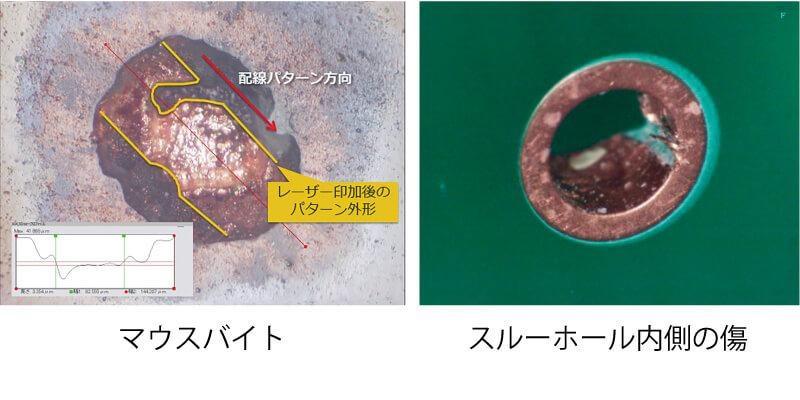 疑似的に作ったマウスバイトとスルーホール内側のキズも、AIによる抵抗値分布の学習と識別により、特異点として検出できました。