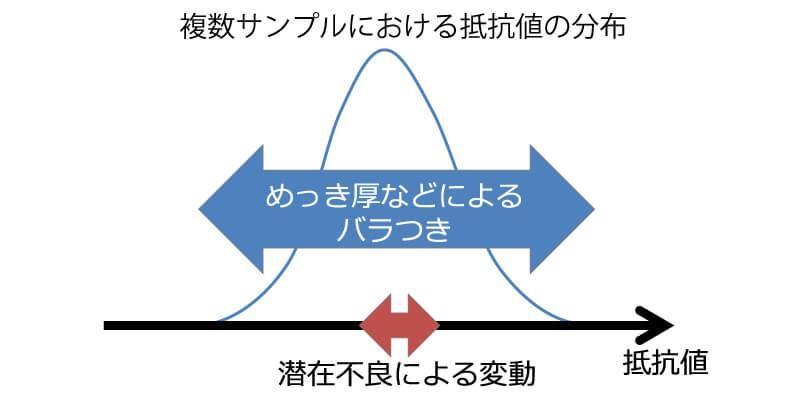 フライングチェッカーによる抵抗検査では、めっき厚などによるバラつきの中に、不良による抵抗値変化が埋もれてしまいます。