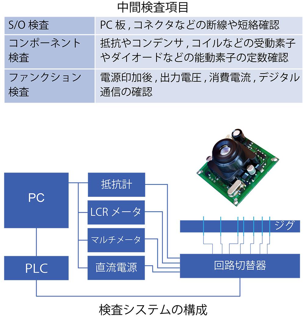 カメラモジュールの中間検査では、右表の内容の検査を実施します。従来、この検査は、各ポイントにプローブを立てたジグと、回路切り替えのためのリレー回路、そして抵抗計やマルチメータ、LCRメータといった計測器や直流電源、そしてすべてをコントロールするパソコンやPLC、さらに検査シーケンスを実行するプログラムで構成されています。この構成では、以下の課題があります。