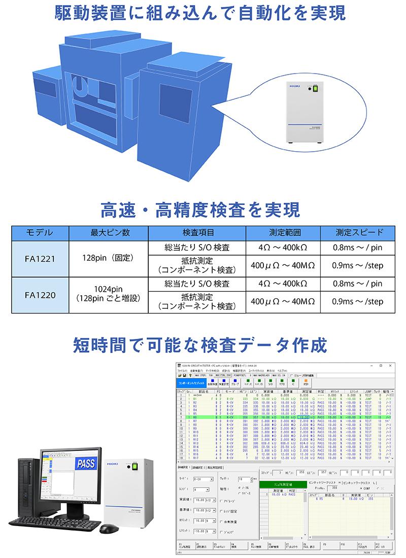 ショート・オープンテスタFA1221、インサーキットテスタ FA1220、は回路切替器(スキャナ)と抵抗計をコンパクトなボディにすべて内蔵し、パソコンソフトで作成した検査シーケンスに従い動作します。搭載されたI/Oボードで外部駆動装置と連動させることができます。ワークをZ軸方向に微小移動させながら検査することで、接触高さ位置や接触抵抗値を自動で確認することができます。