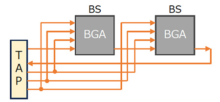 バウンダリスキャン(JTAG)は、プローブピンコンタクトが困難になりつつあった高密度実装基板に対する電気検査の方法として1990年にIEEE Std.1149.1として誕生した実装基板検査規格です。バウンダリスキャン対応デバイスに内蔵されたTAPコントローラを介して各テストセル(仮想ピン)同士の接続確認や簡単な動作確認を行うことができます。対応デバイス間をシリアル通信で結ぶ(ディジーチェーン)ことで、最低5本の信号線で試験が可能です。