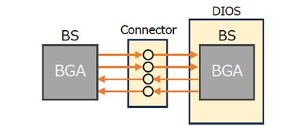 バウンダリスキャンデバイスとコネクタ間のテスト。コネクタ外部にバウンダリスキャンが搭載されたI/Oアクセサリ(DIOS: Digital I/O Scanmodule)を接続してテスト