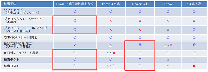 (*1電子回路基板の実装後検査に於いて、通電検査による半田付け接続信頼性検査で検出可能な不良内容とそれに要する時間やコストなどを比較した場合に対する当社の見解です。全ての観点を総合したものではありません。)