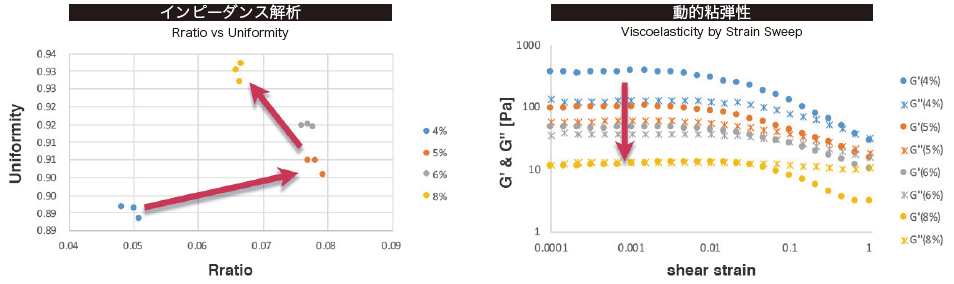 分散剤添加量によるスラリーへの影響を、インピーダンス、レオロジーの両方で確認