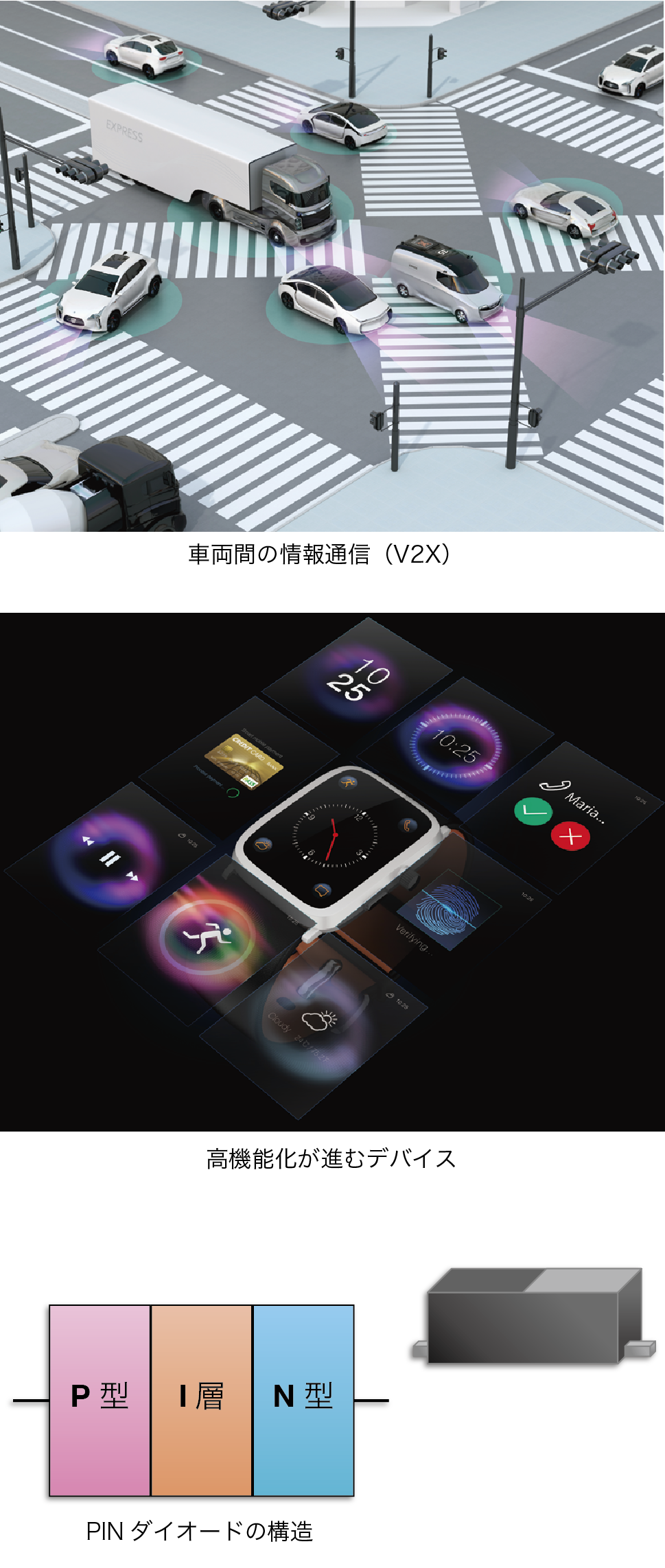 高速の信号を扱う回路に欠かせない部品のひとつに「PINダイオード」があります。PINダイオードはPN接合の間にI層(Intrinsic Layer)を挟みこんだ半導体です。P型、I層、N型のそれぞれの頭文字をとりPINと呼んでいます。