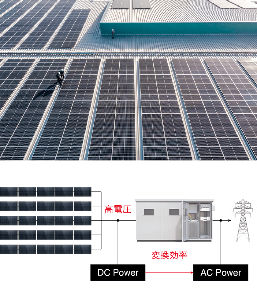高い電圧で送電すると、エネルギーの損失を抑制できます。発電システムの効率を上げるために、高電圧の入力に対応したPCSが増えています。この効率を測定する場合、高電圧の測定が必要です。