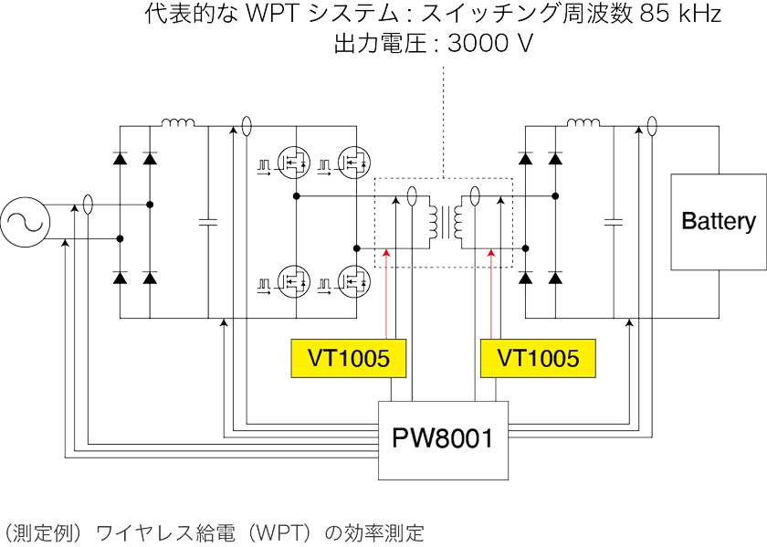 パワーアナライザ PW8001とAC/DCハイボルテージディバイダVT1005を使用し、ワイヤレス給電システム(WPT)の効率を測定できます。