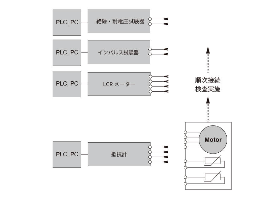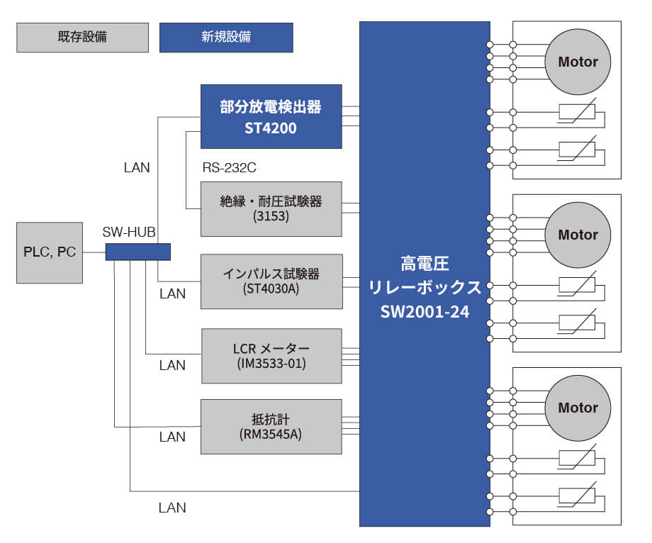 3台の完成モーターの静的検査を同時に行うために、抵抗計 RM3545A、LCRメータ IM3533-01、インパルス巻線試験器 ST4030A、絶縁耐圧試験器 3153、および部分放電検出器 ST4200を高電圧リレーボックス SW2001-24に接続しています。