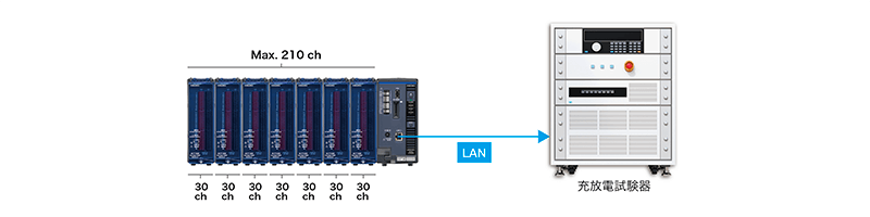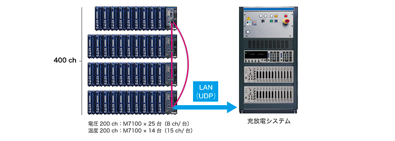 400 Vのバッテリーパックで各セルの電圧と温度を測定し、充放電試験器にデータ転送する場合の測定器の構成例をご紹介します。M7102は1台で30 chまで測定できます。省スペースかつ、少ない投資で実現できる計測システムです。