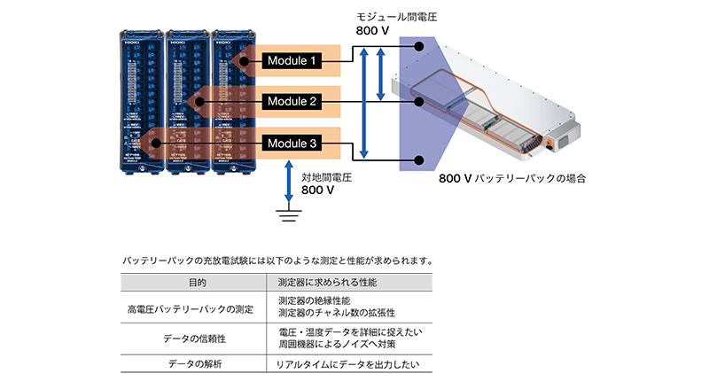 バッテリーパックの各セル電圧は約4 Vと低いですが、例えば800 Vのバッテリーパックの各セル電圧の測定には、対地間最大定格電圧DC 800 V以上の測定器が必要です。800 Vのバッテリーパックを構成するには約200個のセルが直列に接続されていることになります。すべてのセルの電圧と温度を測定するには、約400チャネルが必要になります。
