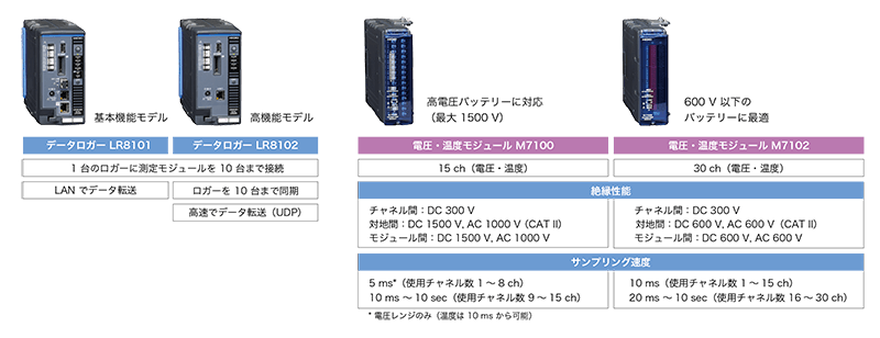 HIOKIのデータロガーLR8101, LR8102は、高電圧化するバッテリーの充放電試験に最適なデータロガーです。必要な絶縁性能やサンプリング速度、チャネル数に応じて、測定モジュールM7100またはM7102を必要な台数組み合わせて測定します。