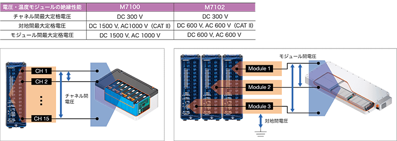 特に絶縁性能においては、連結した計測モジュール間電圧や対地間電圧は耐電圧とは異なることに注意が必要です。耐電圧とは、安全規格上、耐圧試験で電圧を印加される対象機器が電源OFFの状態で1分間印加して壊れないことを保証する電圧のことです。常時その電圧がかかっても問題ないということではないため、耐電圧800 Vを謳っている製品であっても、モジュール間または対地間に常時800 Vの電圧がかかるバッテリー電圧を測定できるということとは異なります。