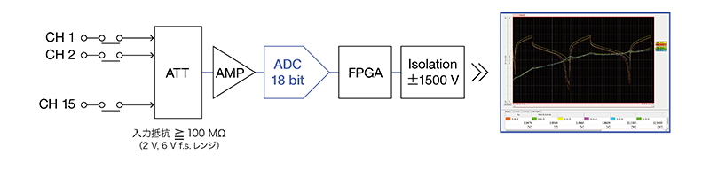 データロガーLR8101, LR8102は、バッテリーの各セルの温度と電圧を安全かつ詳細に測定し、記録できます。ロガー本体と測定モジュールを組み合わせて、入力チャネル数を最大3000 chまで簡単に拡張できます。EN IEC 61010 安全規格に準拠したDC 1500 V CAT IIの絶縁性能で、高電圧システムを安全に測定できます。最高サンプリング速度5 msかつ高分解能で、電圧変動を詳細に捉えることができます。LR8102は測定したデータを1データ毎に高速出力できます。充放電試験中の電圧と温度をリアルタイムにモニタリングできます。