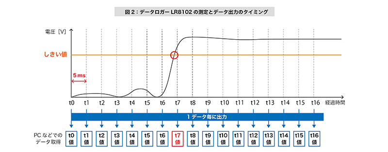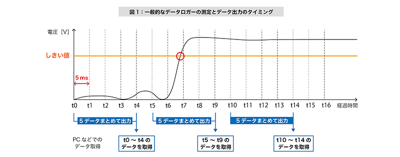 図1は、一般的なデータロガーでの測定とデータ出力のタイミングの例です。電圧値はt7でしきい値を超えていますが、t9のタイミングまでそのデータを取得することができません。