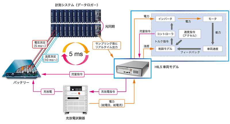EVの開発プロセスの検証段階では、シミュレーションシステム(Hardware in the Loop Simulation、以下HILS)が活用されています。バッテリーパックの個々のセルを監視するBMS(Battery Management System)がない状態で検証する場合や、EVの走行環境を模擬して各セルの充放電制御を検証する際は、バッテリーの実機とシミュレーションを組み合わせた検証が行われます。このような検証では、各セルの電圧や温度の測定データをリアルタイムに高速でシミュレーションシステムに取り入れることが求められます。