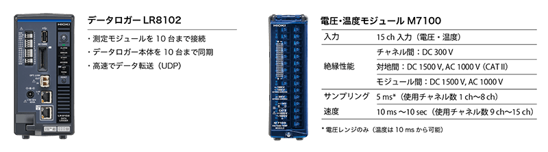 注)1台のM7100の使用チャネル数が8 ch以内かつ、すべてのチャネルのレンジが電圧レンジの時、5 msサンプリングで測定できます。温度測定は10msサンプリングから測定できます。